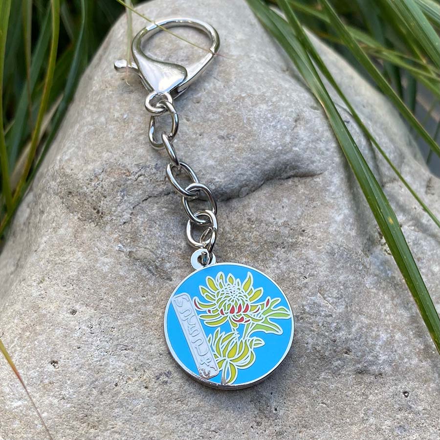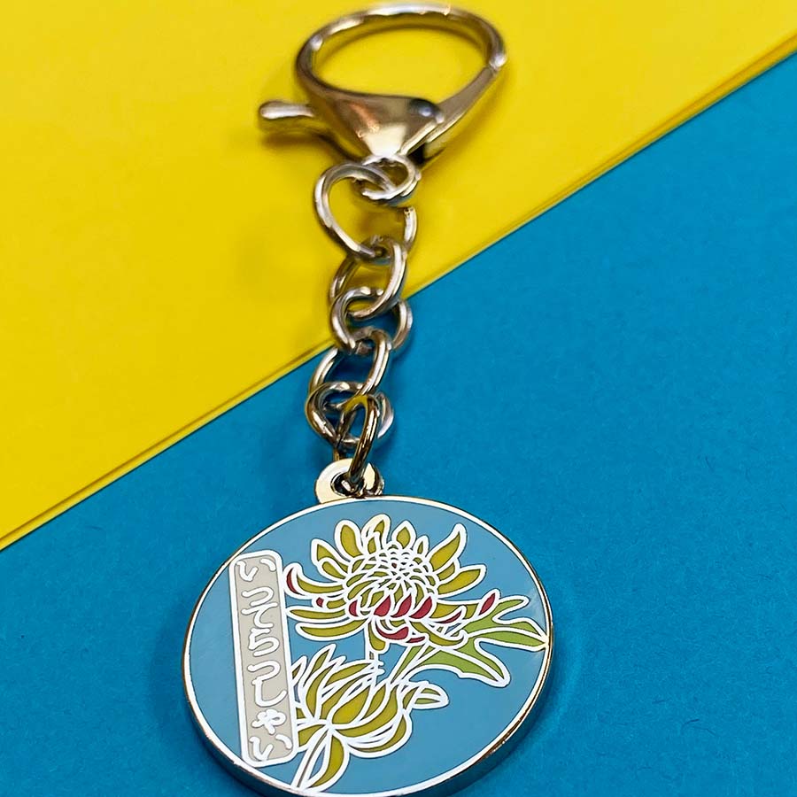 This enamel bag charm says itterashai in Japanese which translates as 'go and come back' in English. Which we take to mean 'safe travels'. Featuring a beautiful crysanthemum that symbolises (in this instance) love, joy and longevity. It's quite a masculine flower so I designed it to be unisex - a charm with a clip to attach to a rucksack (or hide in the luggage) when they're off adventuring without you... a much used expression in Japan - it's their version of 'see ya later' which I like to take as a promise... I can be quite intense!