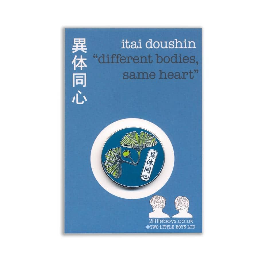 This enamel pin says Itai Doushin in Japanese which translates as 'Different Bodies, Same Heart' in English. Which we think is a great way to express bonds made through friendships, soul mates and people close to you.