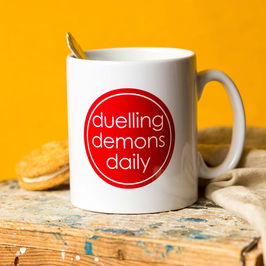 This mug features the slogan Duelling Demons and who doesn't love a bit of alliteration! It makes a perfect 'pick me up' or 'just because' gift for a friend who needs to know that you know... ya know?!
