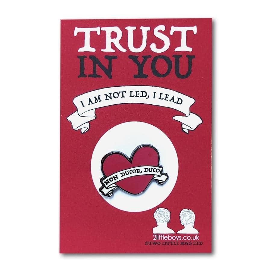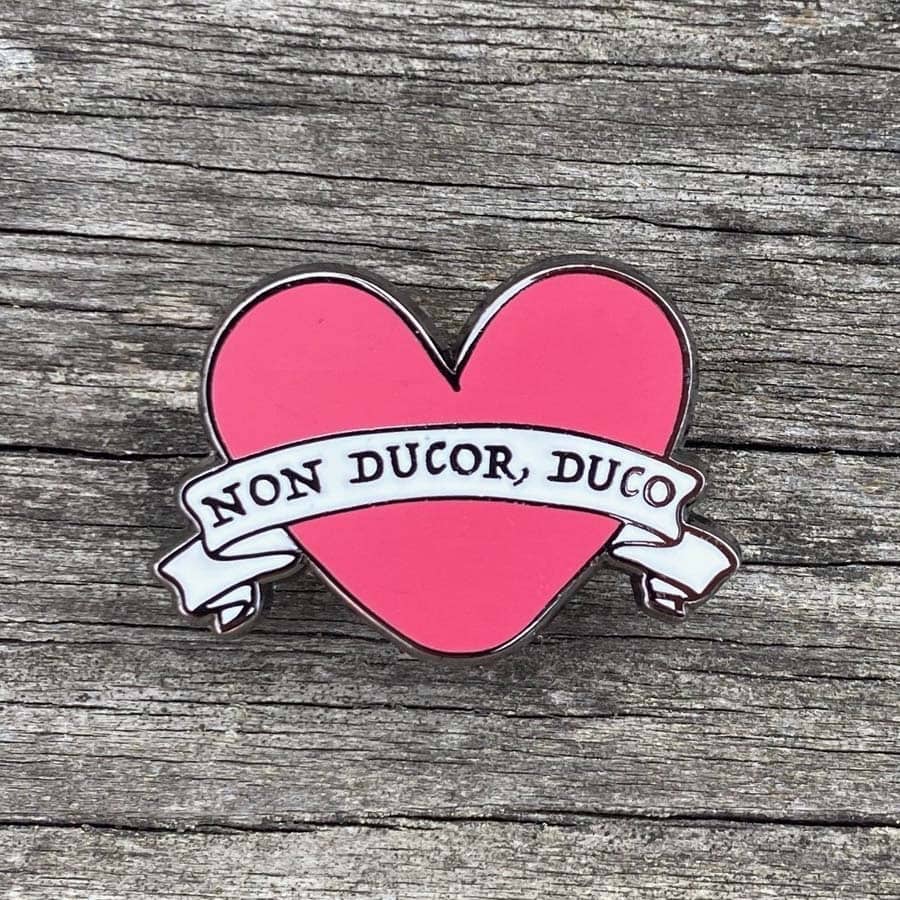 This pin badge says 'Non Ducor, Duco' which translates from Latin to English as 'I am not led, I lead'.