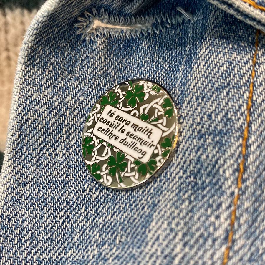 This enamel pin says "tá cara maith cosúil le seamair ceithre duilleog" in Irish which translates as "a good friend is like a four leaf clover" in English.