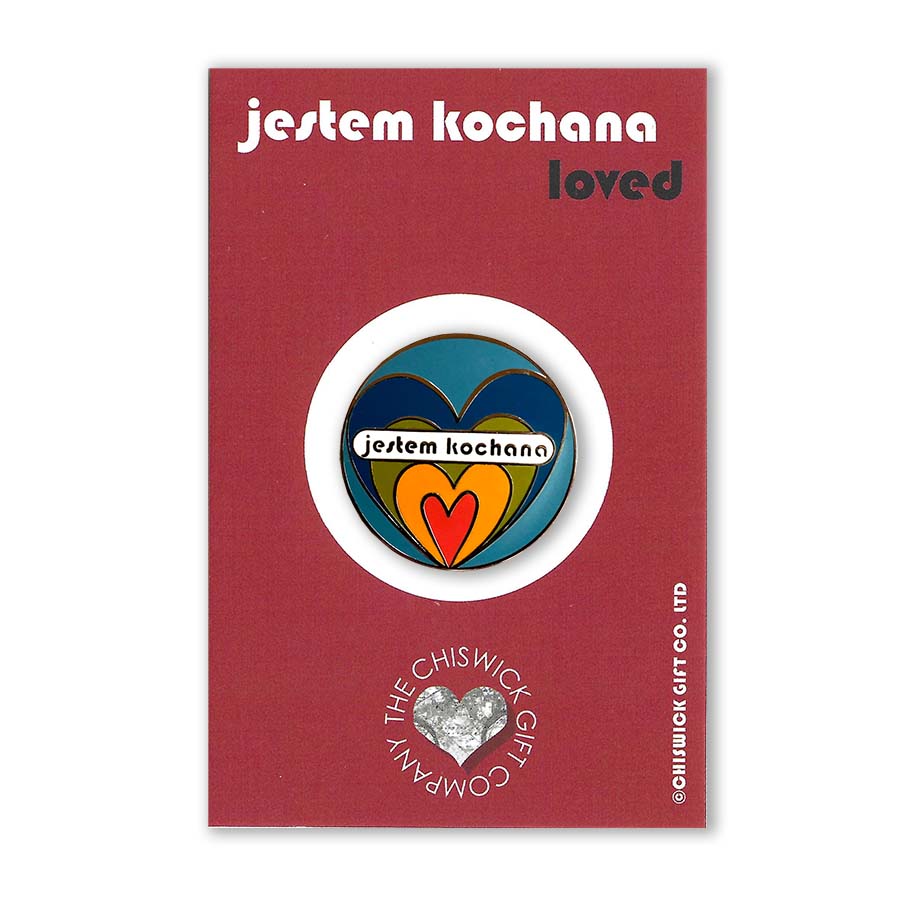 This enamel pin says " jestem kochana" in Polish which translates as "Loved" in English. We have so many different 'Loved' pins in this range so if you'd like to buy for a man, please do go and check out the Hindi and the Japanese versions as they are both gender neutral. Sadly, by the very definition of language, we can't make this a gender neutral pin...