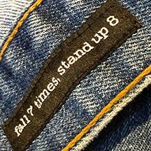 - It says "Fall Seven Times, Stand Up Eight" but in Japanese, so it says it, but doesn't scream it. The English translation is sewn into the inside waist band.