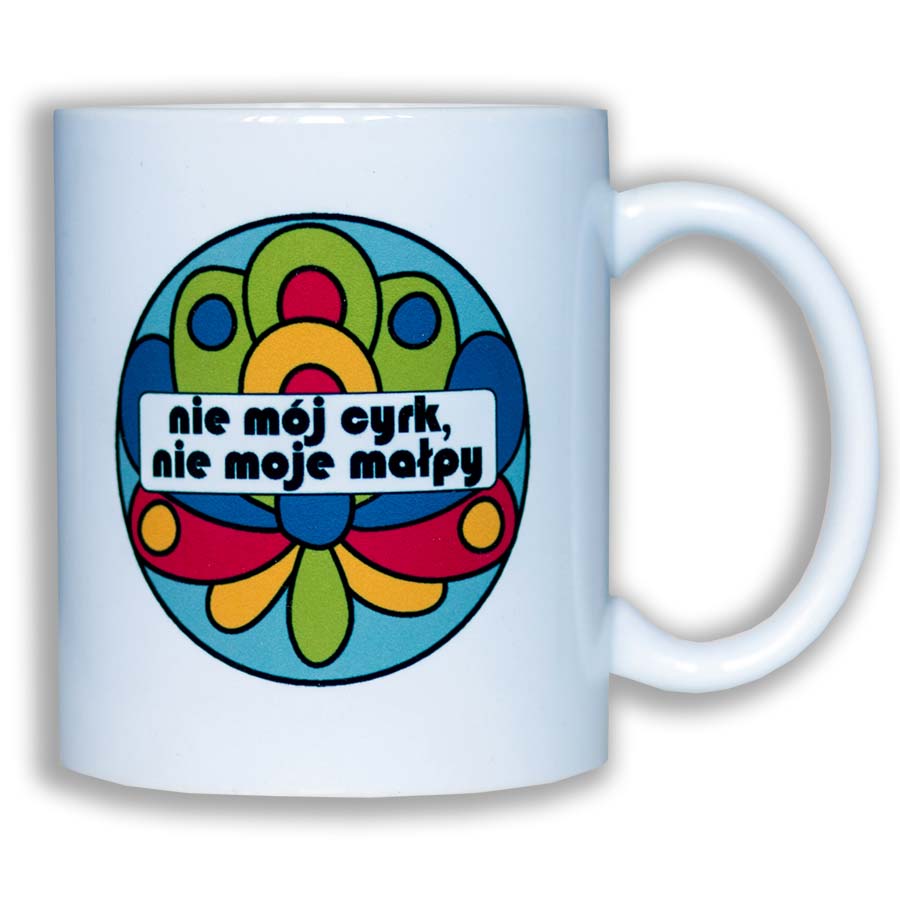 This mug says "nie mój cyrk, nie moje małpy" in Polish which translates as "not my circus, not my monkeys" in English which, quite frankly, is one of the wisest things that anyone can ever say to... well.... anyone!