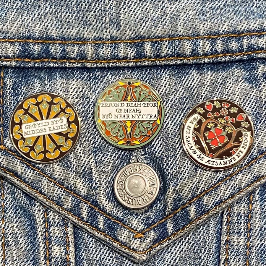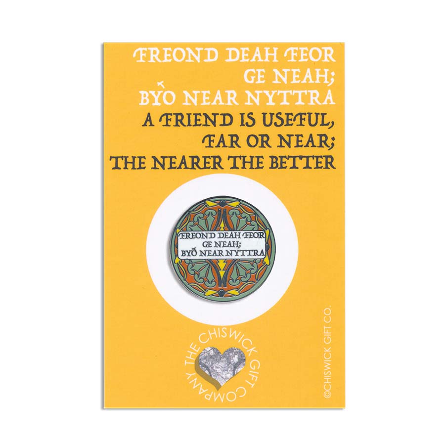This enamel pin says "Freond deah feor ge neah; byð near nyttra" in Old English which translates as "a friend is useful near or far" in English.