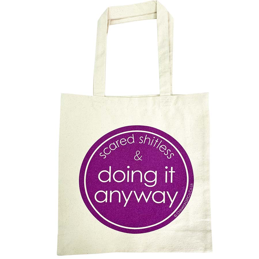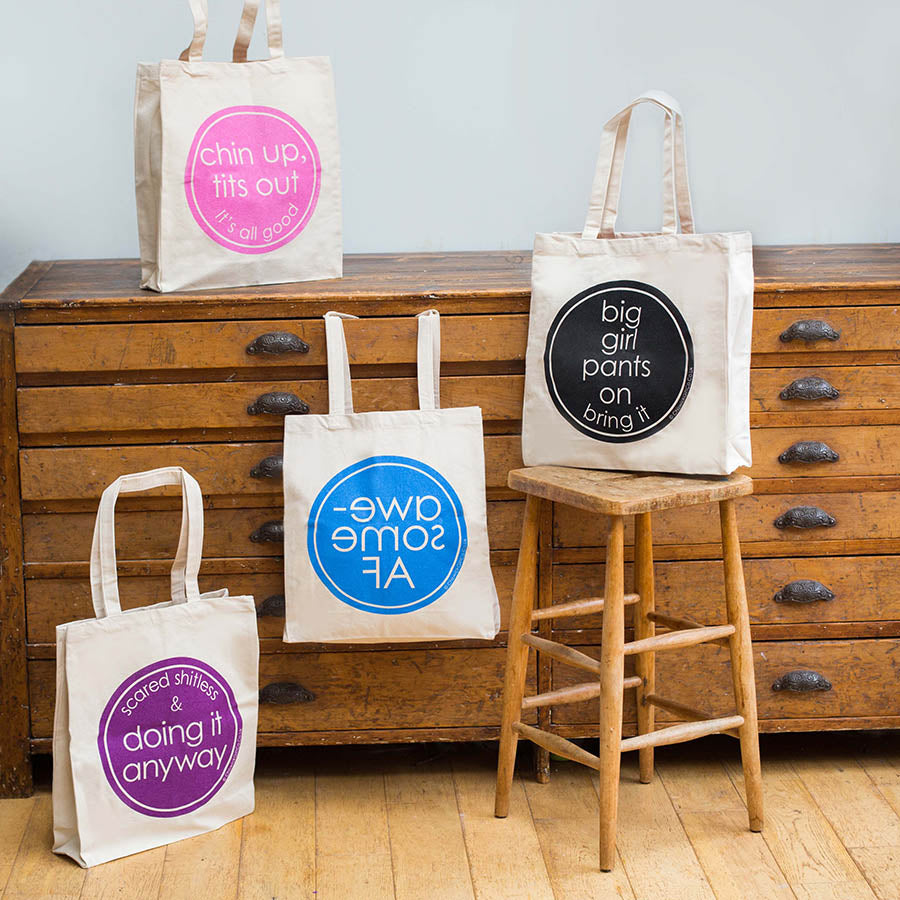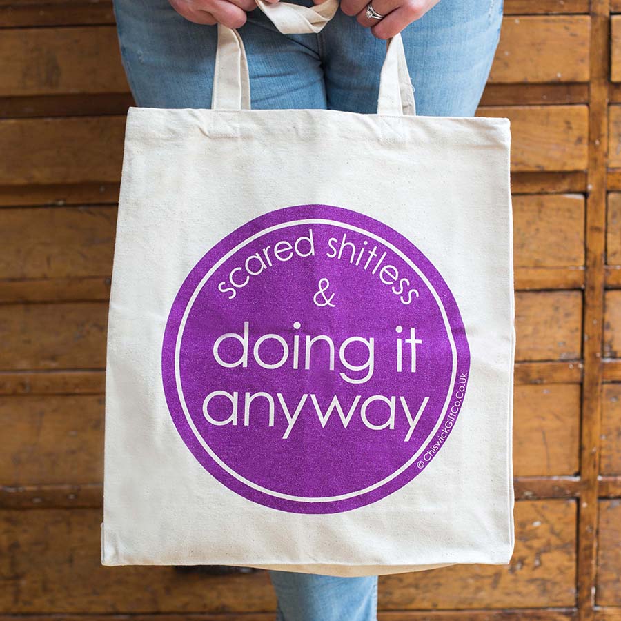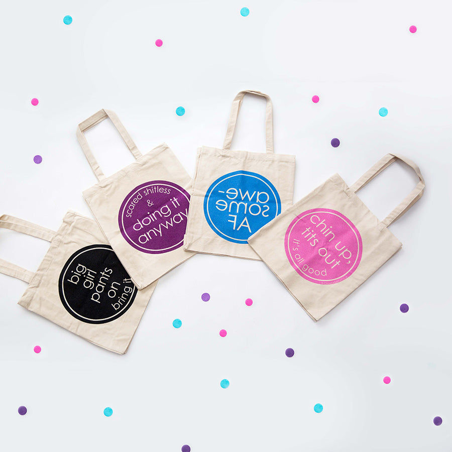 A super strong, glittery, screen printed tote bag that can carry a lot of the burden with our newest design that is so relatable and a perfect 'pick me up' or 'just because' gift for a friend who needs some courage.