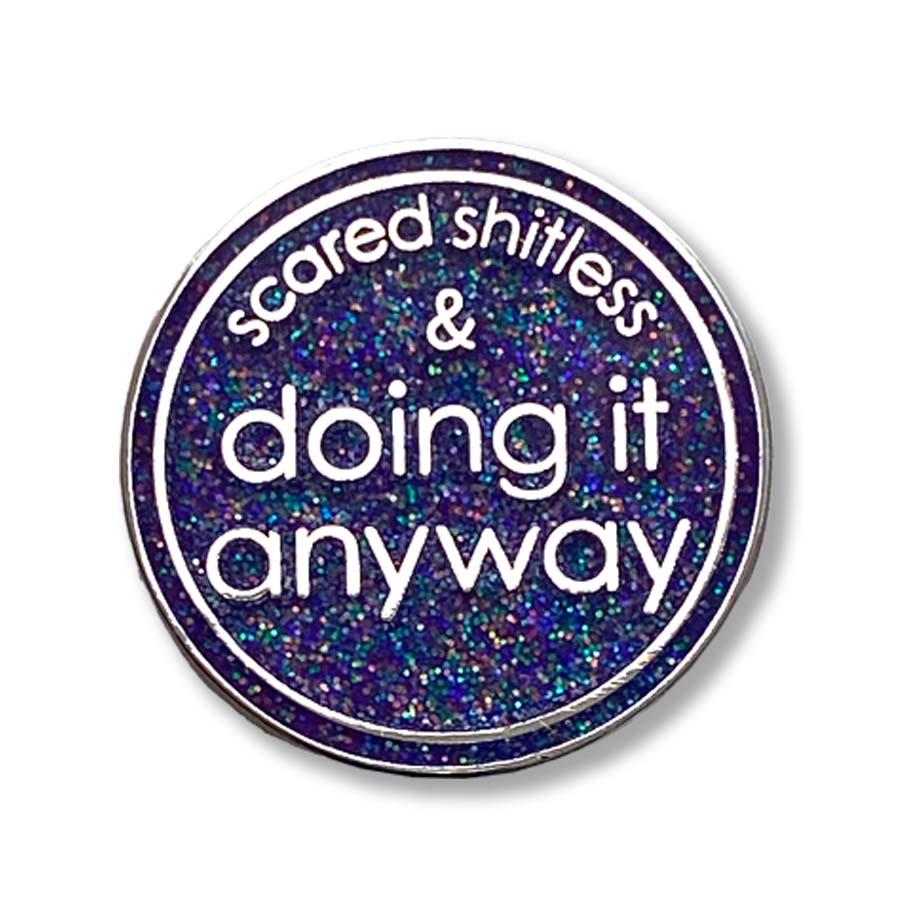 This golf ball marker says "Scared Shitless & Doing It Anyway"