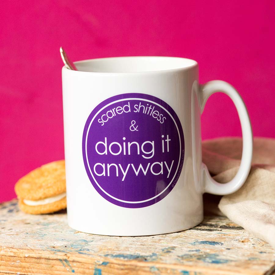 This mug features the slogan Scared Shitless & Doing It Anyway.