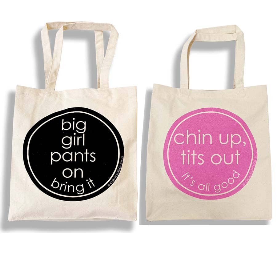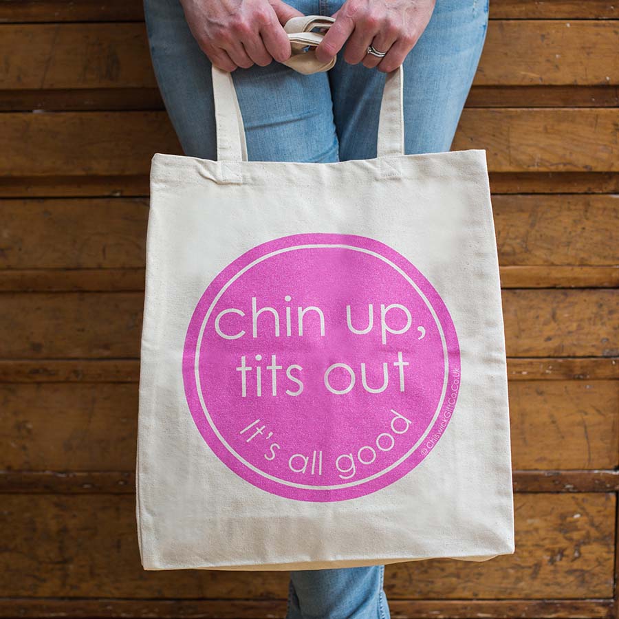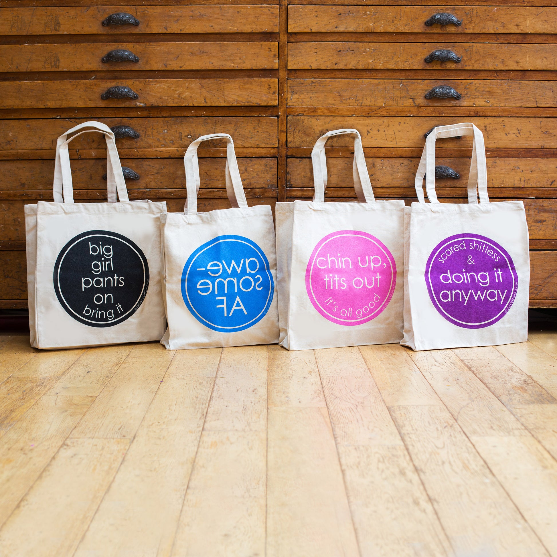 Stunning glittery screen printed motivational tote bags created for us here in the UK that match our pins perfectly.