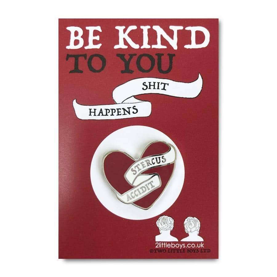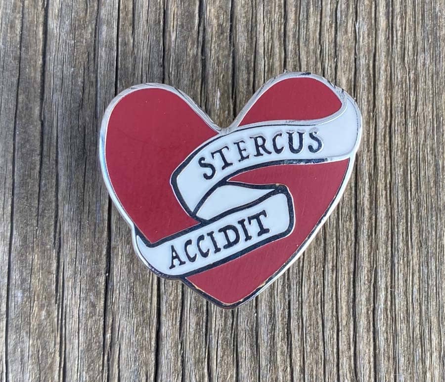 This pin badge says 'Stercus Accidit' which roughly translates from Latin to English as 'Shit Happens'.