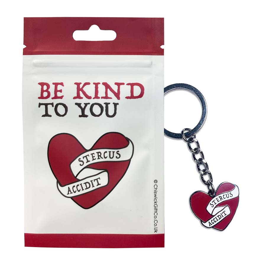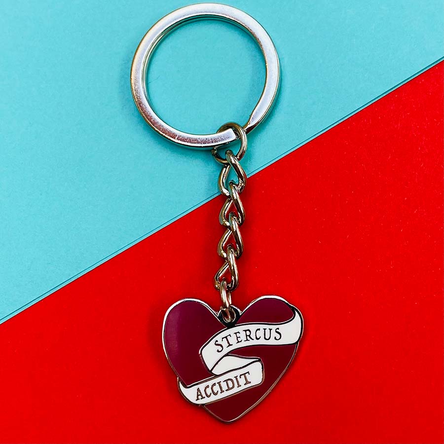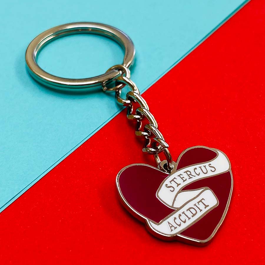 This keyring says 'Stercus Accidit' which roughly translates from Latin to English as 'Shit Happens'.