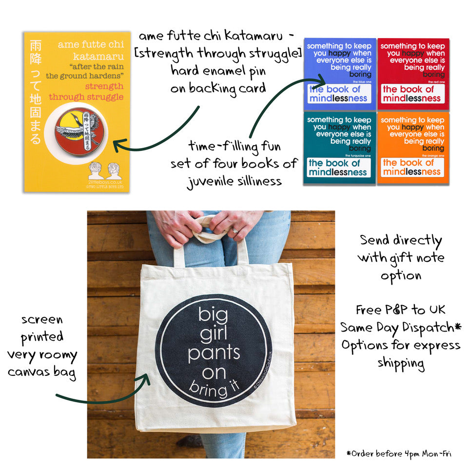 The "Big Girl Pants On - Bring It" Canvas Tote (£18): A sturdy, screen-printed bag for carrying the essentials (and then some). Because sometimes you just have to pull those pants up and get on with it.