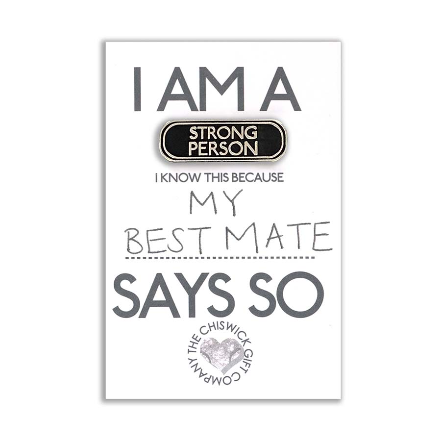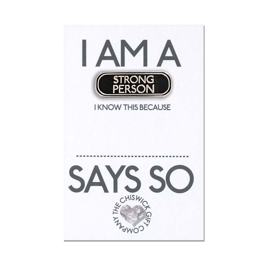 A gorgeous hard enamel pin boasting the simple words "Strong Person" with a black background. The pin comes on a backing card that we've ensured is uncoated so you can fill it in with your name and/or rank and pass it on to the Strong Person in your life, or have us write on there for you and send it directly.