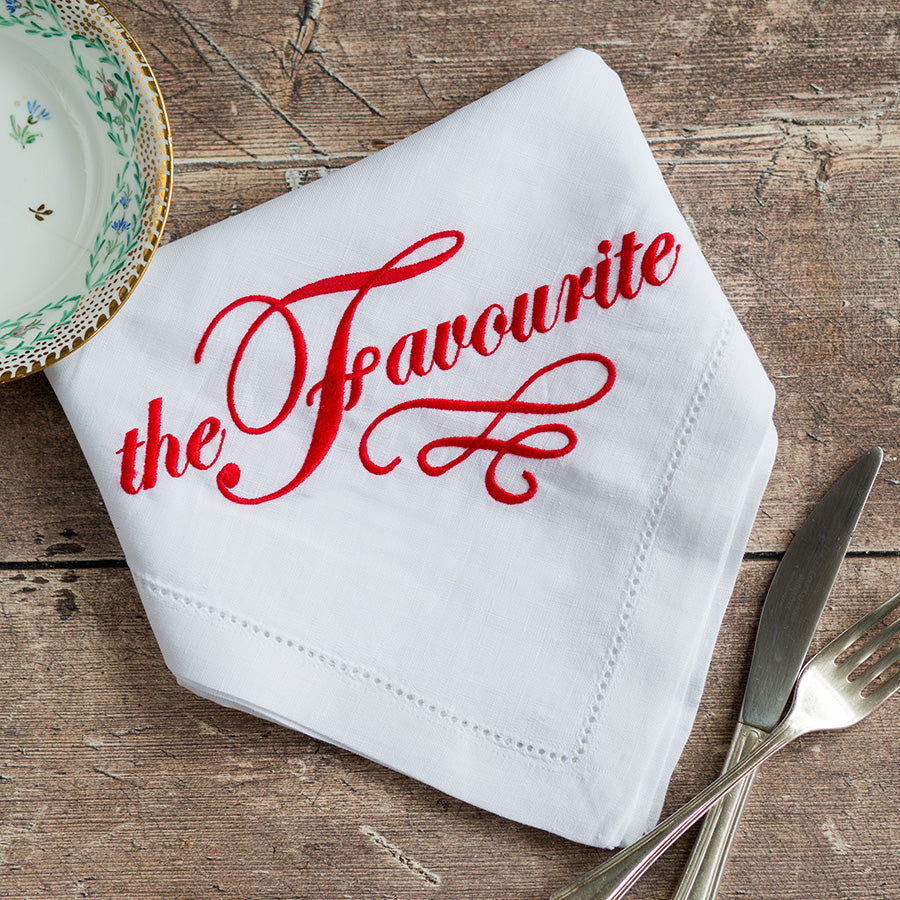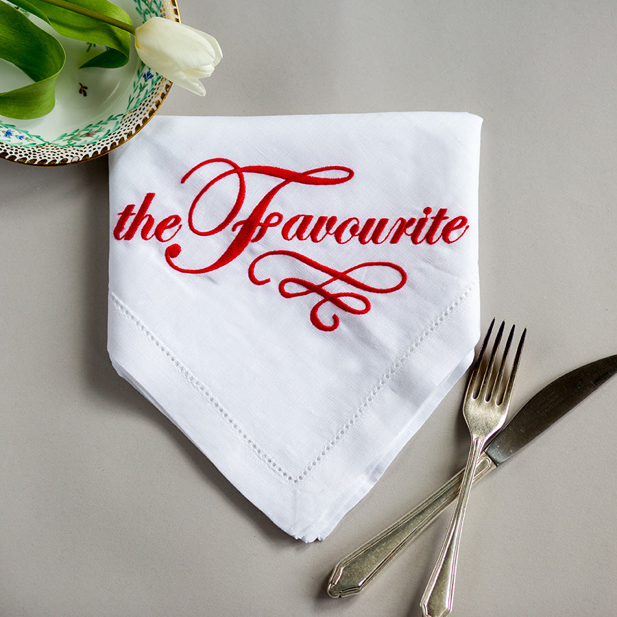 This napkin is beautifully embroidered with the words "The Favourite" - the perfect gift to set the perfect place setting for the favourite in the family (or the one who thinks they're the favourite at least). Part of the "Pick Your Title" range, this stunning single napkin is beautiful, classy and funny - what more could you want?!
