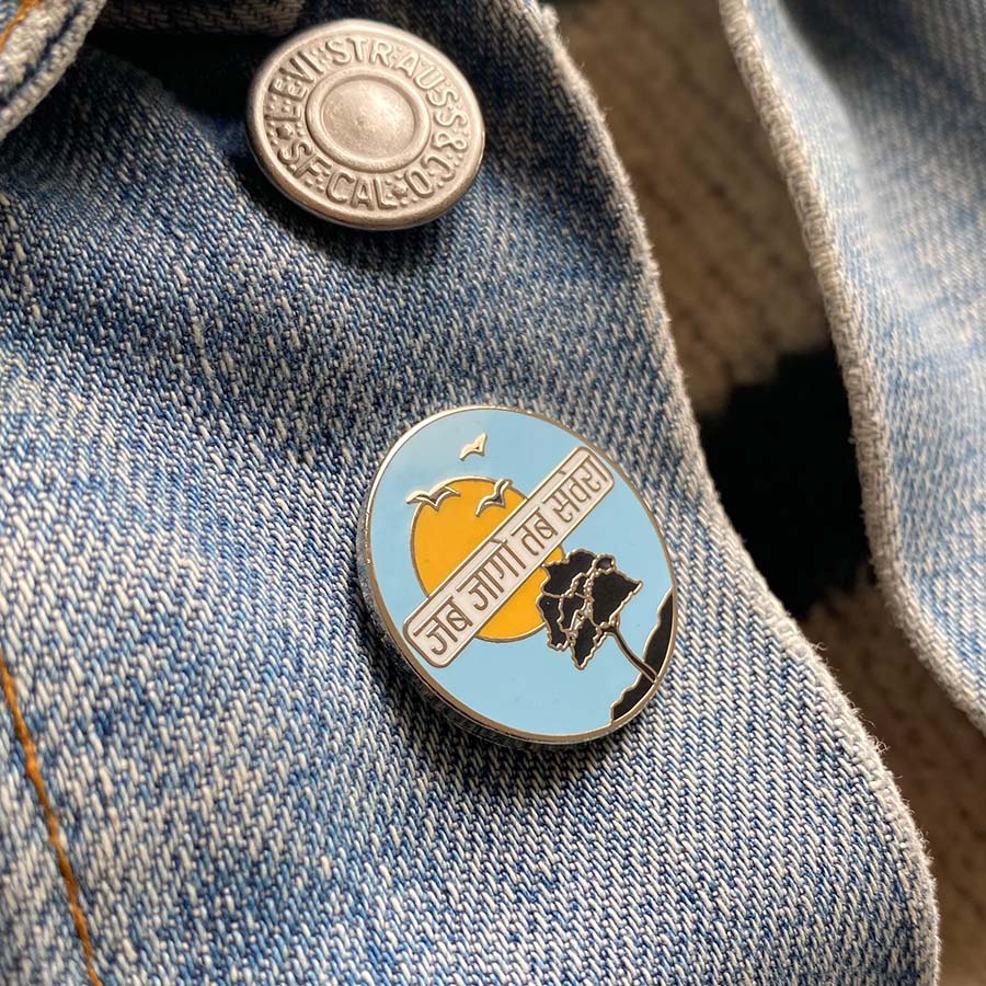 This enamel pin says jab jaago tab savera in Hindi which translates as 'when you wake up it is morning' in English. Which we take to mean 'tomorrow is a new day'. Featuring an Indian style sunrise with a tree of growth, it hopefully reminds the recipient (or you) that every day brings a new sunrise, a new start and the possibility of new beginnings. It also helps that devanagari script is beautiful :)